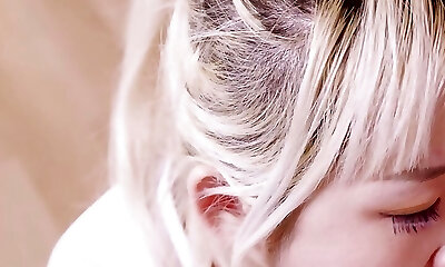 Pretty platinum-blonde teen with humungous melons gets a cumshot in her eye